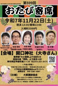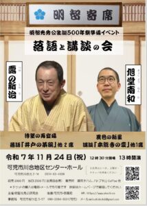 2025年10月10日、大阪市今里で開かれた「地元寄席」に出演させていただきました。南照姐さんの地元であり、同じく地元の露の新治師匠もご出演。旭堂南和、旭堂南鈴、旭堂南桜、旭堂南照、露の新治師匠という順で高座が進み、会場 […]