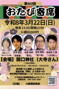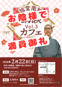 2026年2月8日、和歌山県湯浅町のシーサイド松宮にて、講談をさせていただきました。 最大級の寒波で和歌山でも大雪。 雪の中、安全運転で湯浅までやってきました。 西山浄土宗のお坊さんの集まりにお招きいただきました。 二席 […]